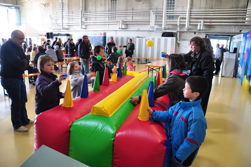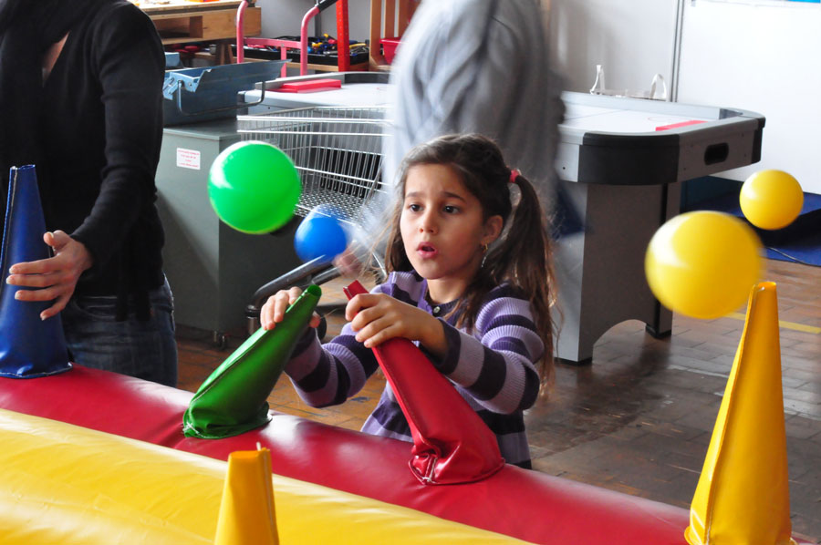 Wer transportiert den schwebenden Ball am schnellsten in den gegnerischen Korb? Ein Actionspass für gross und klein!
